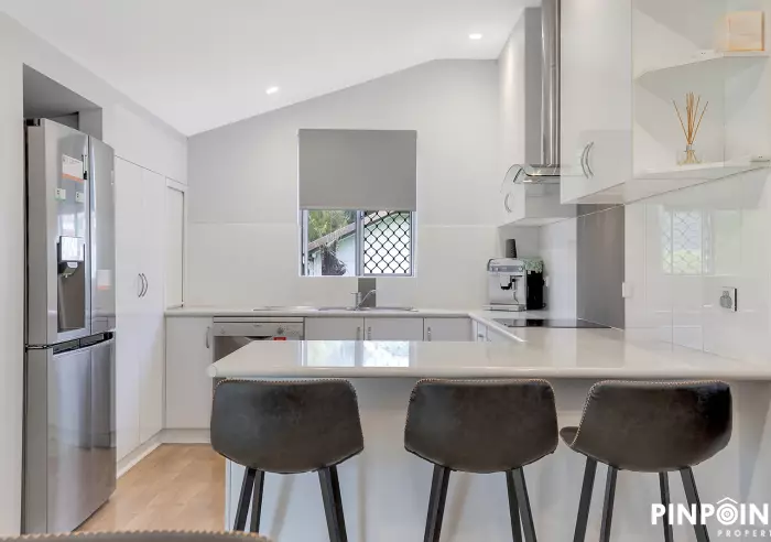 - Spacious kitchen adjacent to dining & living – With stainless steel appliances, stylish feature splash back & abundance of neutral cabinetry including overheads, keeping it neat & tidy won’t be a problem either! After dinner, slide on over to your comfy lounge room to settle in for a movie. This space is complete with split A/C & ceiling fans for year-round comfort