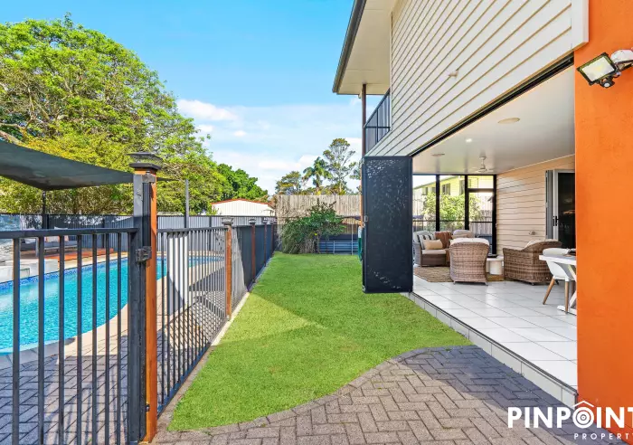 - Resort-style outdoors – A 10m pebblecrete saltwater pool transforms the sprawling 776m2 property into a tropical oasis, complete with a stunning water feature, leafy backdrop & timber deck for sunbathing. Relax with friends here or on your all-seasons patio while the kids play in the pool, or ride their scooters on the concreted surrounds spanning from front to rear down the left side of the home, fully fenced & tucked safely away from the street behind a powered sliding gate at entry. Prefer a more ‘hands-on’ weekend? Your 8m x 5m powered shed is perfectly equipped for all the tools, toys & projects!